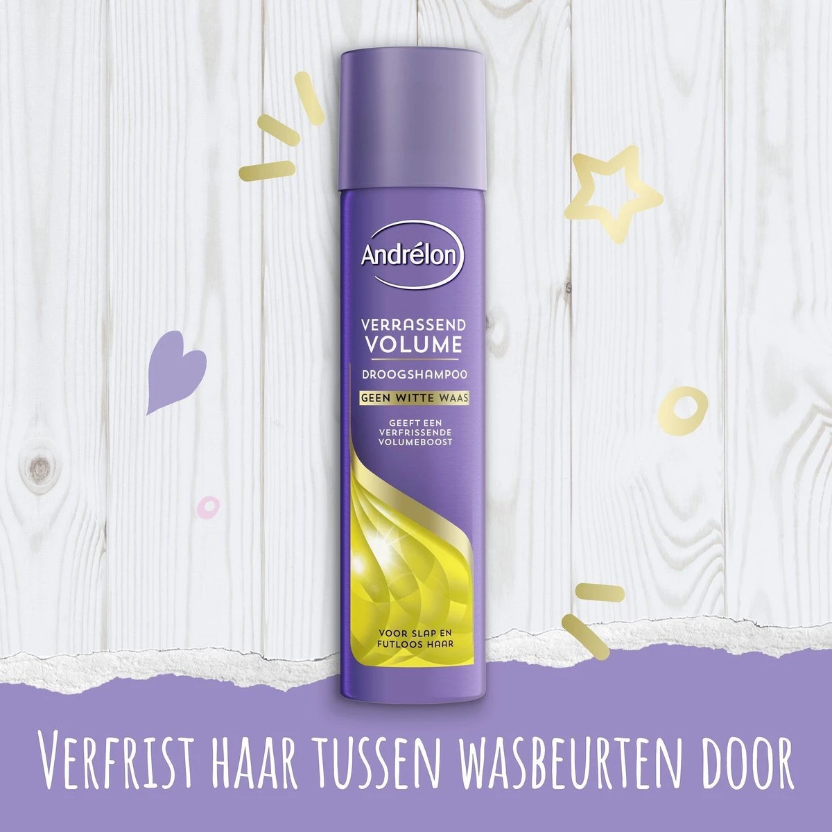 Speciaal voor haar dat wel wat volume kan gebruiken, heeft Andrélon de Verrassend Volume lijn ontwikkeld. De haarverzorgingsproducten zijn verrijkt met collageen en geven je niet alleen meer volume in je haar, maar zorgen er ook voor dat je haar voller en dikker aanvoelt. De Verrassend Volume shampoo zonder wassen heeft een lift-up system wat speciaal is ontwikkeld voor slap of futloos haar dat snel vet wordt en dat tussen de wasbeurten door wel een opfrisser kan gebruiken.