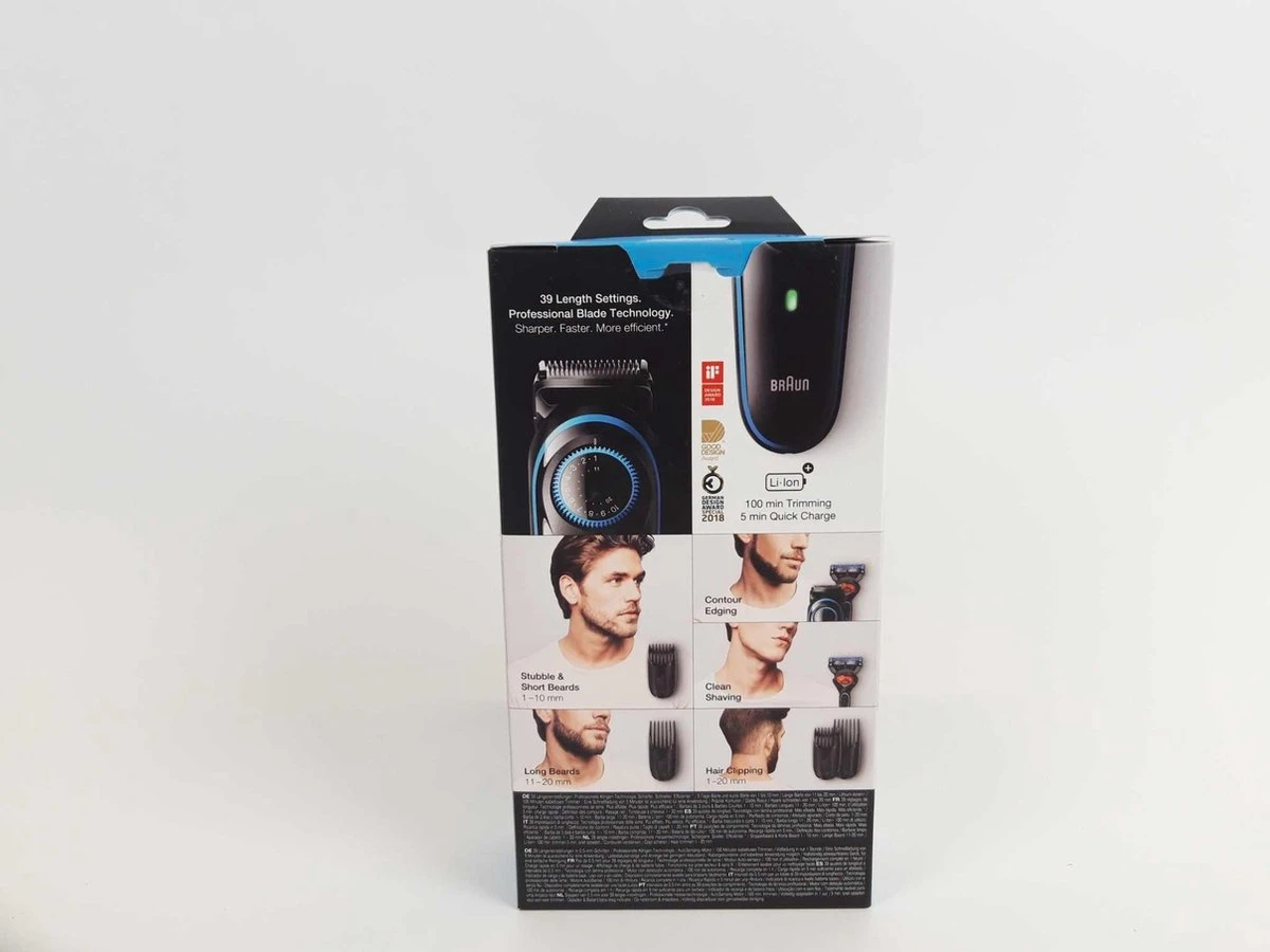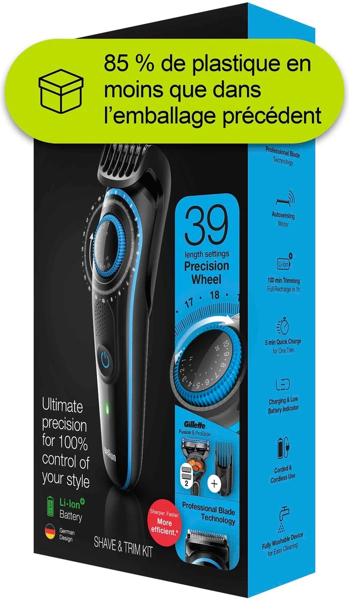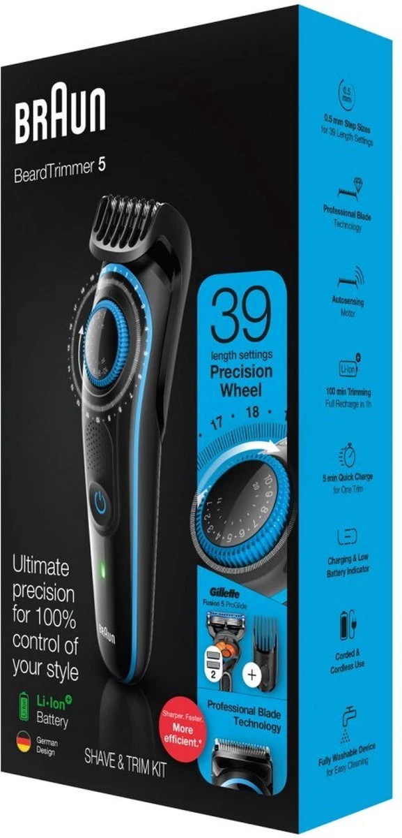 De innovatieve AutoSensing-technologie van Braun leest je baard 13 keer per seconde en past de kracht van de trimmermotor aan de dikte ervan aan, waardoor hij elk baardtype moeiteloos trimt.De korte baardkam helpt je om een korte tot middellange baard (0,5 – 10mm) te onderhouden en je haar te trimmen.Onderhoud langere baard- of haarstijlen met de 11 – 20mm kam.Creëer nauwkeurige lijnen en randen in de nek en op de jukbeenderen met de Braun baardtrimmerkop.Glad scheren van de hals, jukbeenderen en gezicht met het Gillette Fusion 5 ProGlide scheermesje met FlexBall-technologie.De ultrascherpe mesjes snijden lang of dik haar gemakkelijk af zonder trekken.100 minuten trimmen. Volledig opgeladen in 1 uur. 5 minuten snel opladen voor één keer trimmen.Veilig af te spoelen onder stromend water voor eenvoudige reiniging.rgonomische greep voor intuïtief gebruik. Dit alles zorgt voor moeiteloos trimmen.