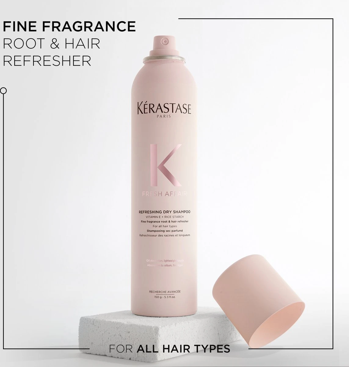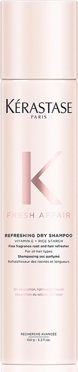 Kérastase Fresh Affair is een verfrissende droogshampoo voor alle haartypes. Deze fijne poederformule absorbeert onmiddellijk overtollige olie om alle haartypes en wortels op te frissen, waardoor er een licht, schoon gevoel achterblijft. De verslavende touch van Neroli geeft een onweerstaanbare blijvende geur, 24 uur lang. Jouw ultieme geheim voor je second-day haar, touch-ups voor na de workout en wanneer je een opfrisbeurt nodig hebt. De Kérastase Fresh Affair droogshampoo is geformuleerd met rijstzetmeel en vitamine E*: Rijstzetmeel absobeert talg en productopbouw, waardoor de wortels en het haar schoon en fris blijven. Vitamine E is een voedingsstof met beschermende eigenschappen die voorkomt dat het haar en de hoofdhuid uitdrogen. * vitamine E derivaat