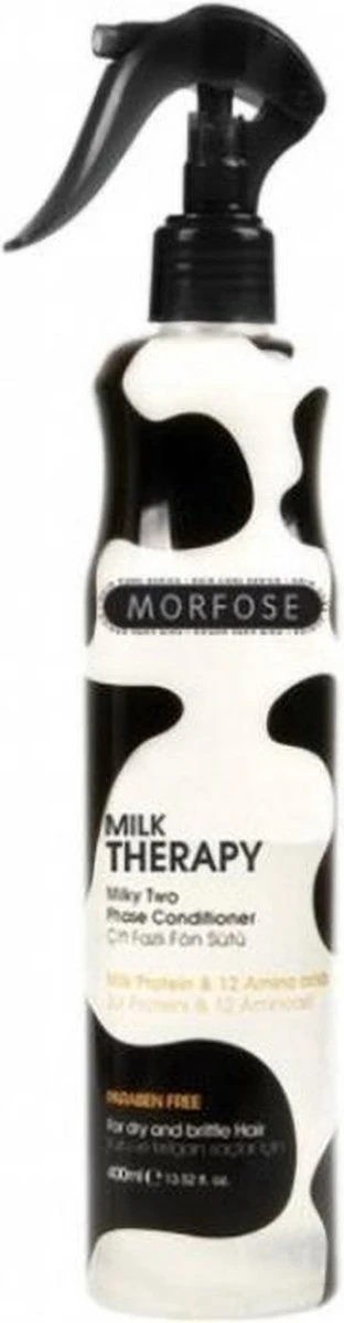 Milky Two Phase Conditioner van Morfose is een tweefasenconditioner voor droog en broos haar. Gebaseerd op melkeiwitten en aminozuren. Het hydrateert, verzacht en herstelt de verloren glans van het haar. Het beschermt tegen externe factoren. Herstelt beschadigde uiteinden en vergemakkelijkt het kammen van het haar.