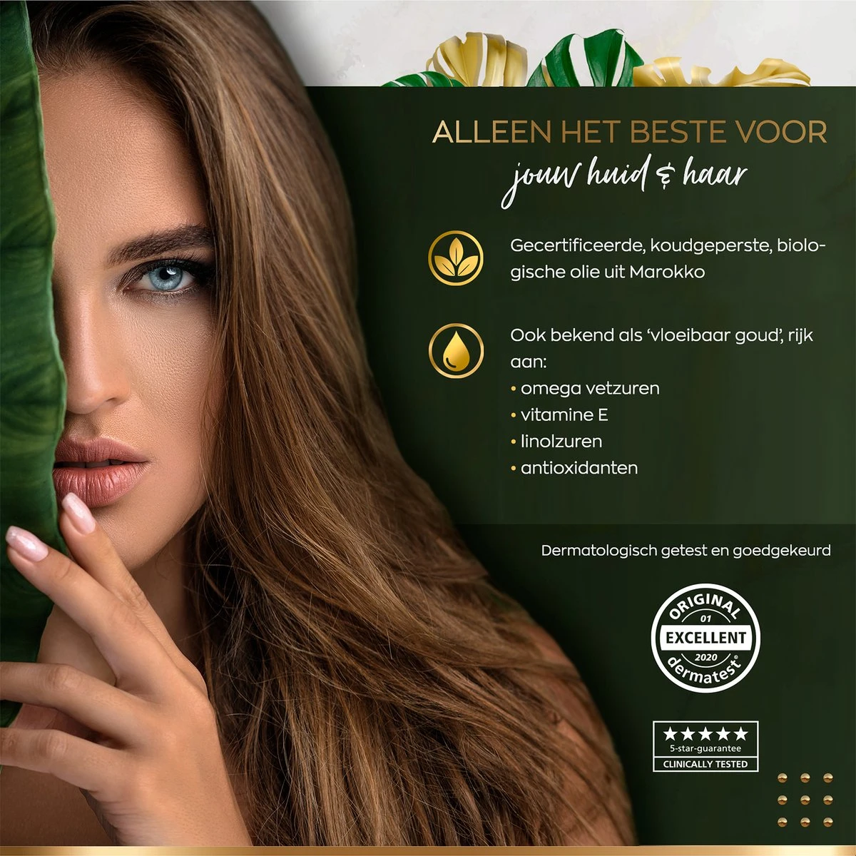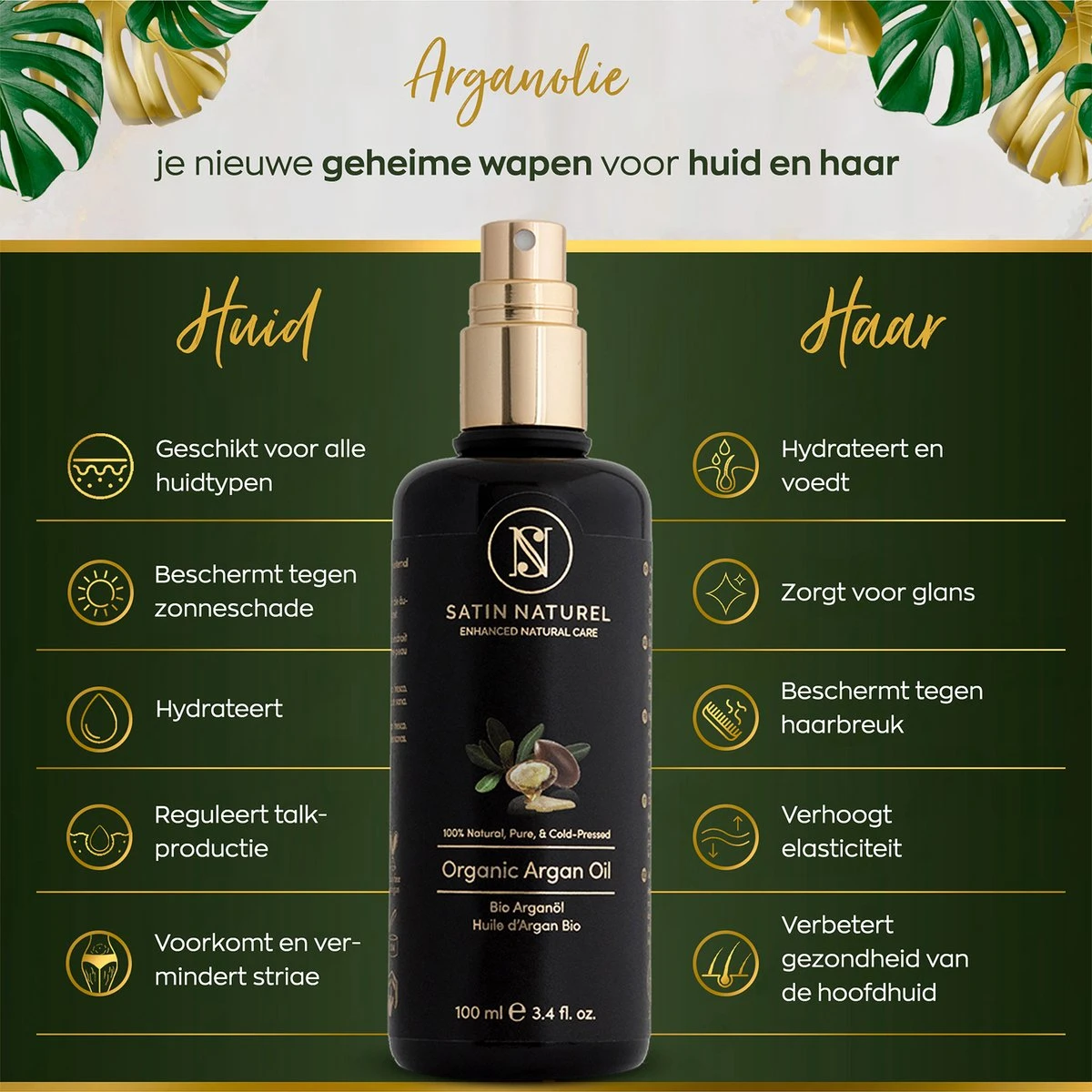 - Biologische arganolie beschermt huid en haar tegen schadelijke invloeden van het milieu en biedt intensieve verzorging zonder te verzwaren.