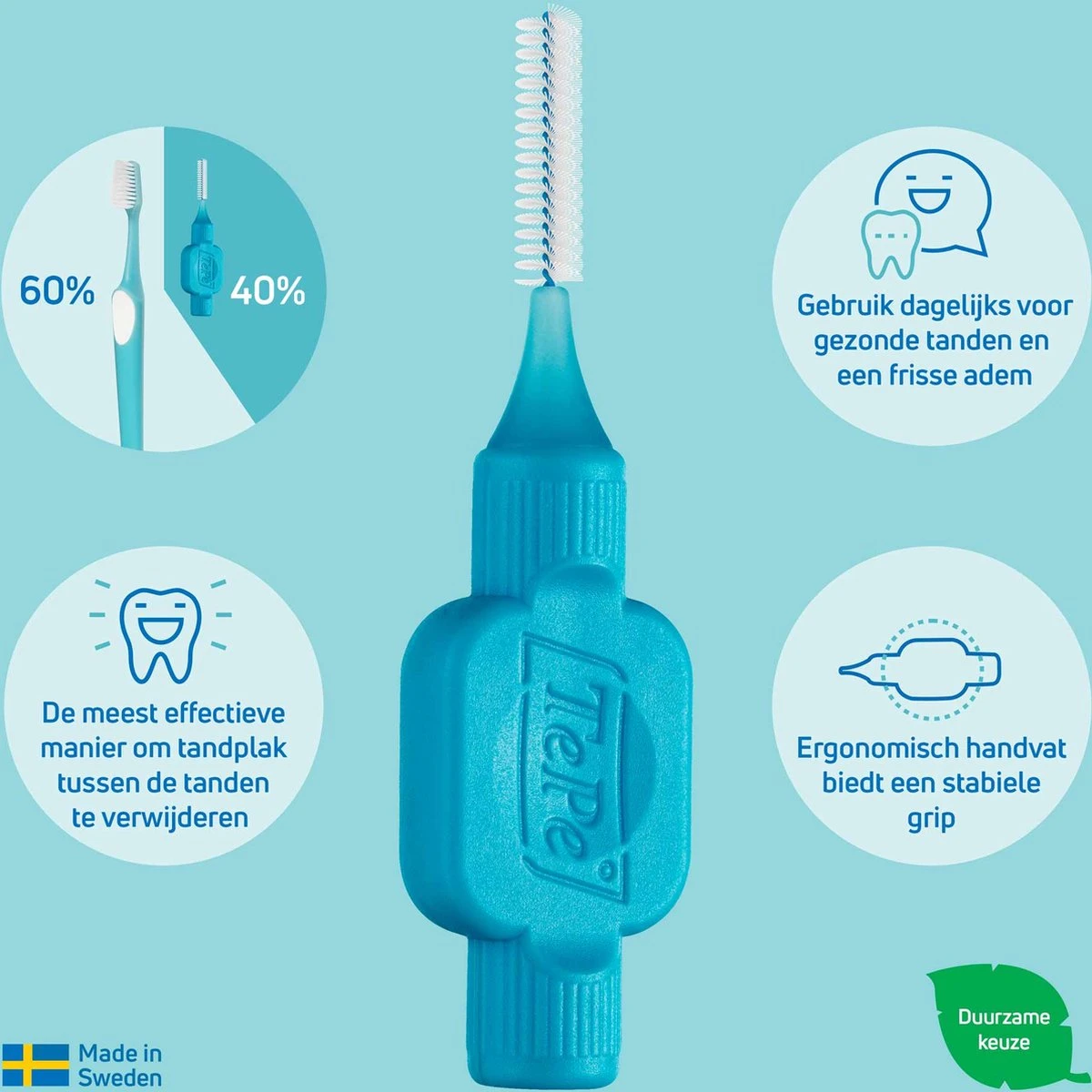 TePe Interdentale Ragers Original Groen De duurzame interdentale ragers van TePe zijn ontworpen om de openingen tussen je tanden en kiezen te reinigen. Plekken waar je met een gewone tandenborstel meestal niet bij kan komen. Een rager kan gebruikt worden om tandplak en bacteriën tussen tanden, implantaten, kronen en bruggen optimaal te verwijderen. Op deze manier verminder je de kans op tandvleesontstekingen, gaatjes en een slechte adem. Productkenmerken• De meest effectieve manier om tussen je tanden te reinigen.• Een buigbare draad voor betere toegang• Met kunststof gecoate metaaldraad voor veiligheid en comfort• Gebruiksvriendelijk en ergonomisch handvat• Een tandenborstel verwijdert maar 60% tandplak, een interdentale rager verwijdert de overige 40%Kies de juiste maatDe ragers zijn beschikbaar van onze kleinste maat 0,4 mm (roze) tot 1,5 mm (zwart). Je hebt vaak meer dan één borstelmaat nodig. Je tandarts of mondhygiënist kan je helpen bij het kiezen van de juiste borstelmaat of -maten. Als je niet naar de tandarts of mondhygiënist kunt gaan onthoud dan dat een rager goed moet passen, maar nooit tussen de tanden moet worden geforceerd. Een kleine tip is om te beginnen met de kleinste maat; roze waarna je steeds een grotere maat kunt pakken totdat je de borstel tegen je tand en tandvlees voelt drukken. De groene rager van 0,8 mm is geschikt voor een gebit met grote openingen tussen de tanden.GebruiksinstructiePlaats de rager voorzichtig tussen je tanden en kiezen. Beweeg de rager een paar keer over de hele lengte heen en weer. Spoel de borstel zowel tijdens als na gebruik af.